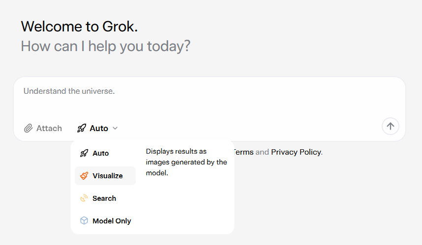 输入框下方的菜单允许用户添加附件,支持切换“自动”、“可视化”、“搜索”和“仅模型”模式,从而更好地控制 Grok 的响应。